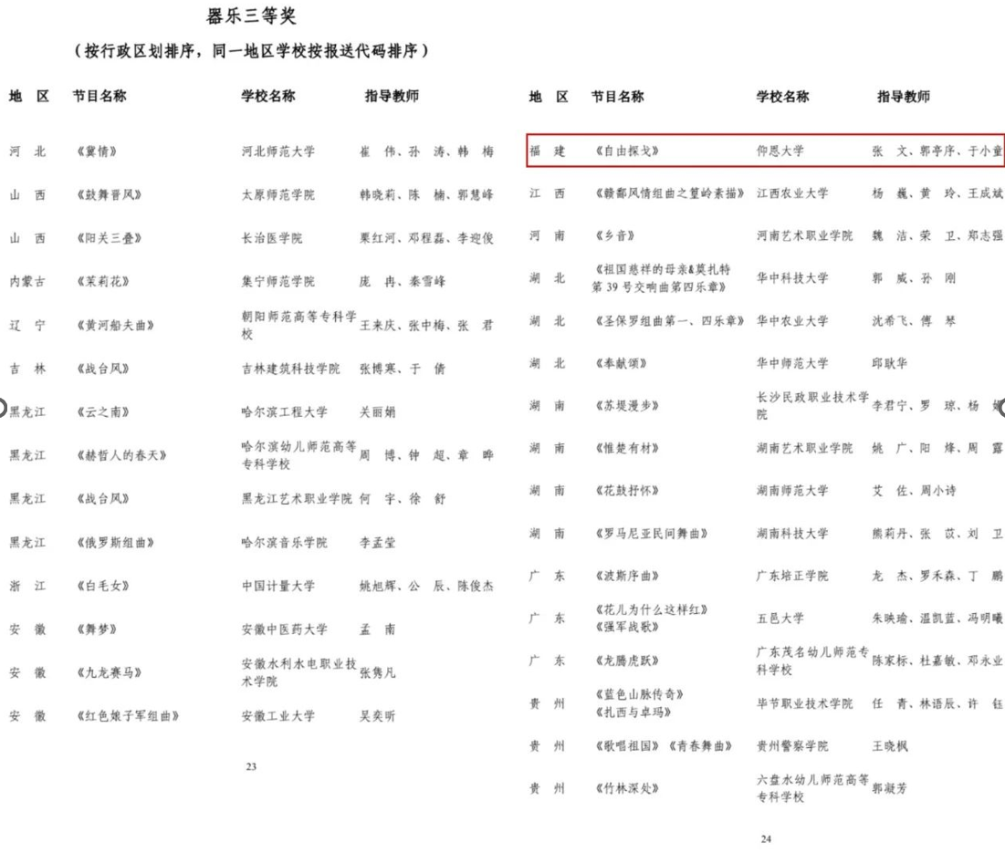 全国第七届大学生艺术展演活动(简称全国大艺展),以“厚植家国情怀,涵养进取品格”为主题,自2004年起每三年举办一届,是我国目前规格最高、规模最大、影响最广的大学生艺术展演活动。开云官网选送的《自由探戈》在该活动中先荣获福建省器乐合奏甲组一等奖,之后更以出色的表现成功入围全国赛,并最终荣获全国第七届大学生艺术展演活动艺术表演类器乐甲组三等奖。这首曲子生动诠释了活动主题,通过其旋律,我们传达了对自由的追求和向往,同时鼓励青年学生们勇敢追求梦想,不畏艰难,勇往直前。