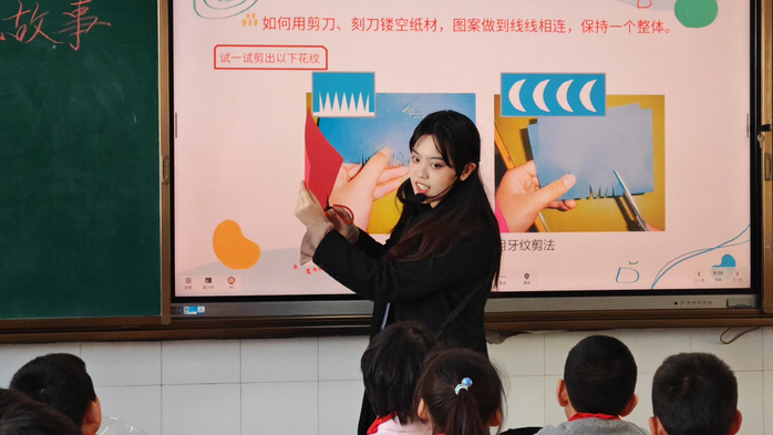 实习期间,同学们深入小学教学一线,在指导教师的悉心指导下,全面参与音乐、美术等学科的教学工作。同学们依据小学音乐、美术课程标准,精心设计了《山谷回声真好听》《理发师》《盘泥条》《剪纸故事》等一系列丰富多彩的课程。在一年级至六年级的课堂上,实习生们通过情境导入、游戏互动、示范演示等多样化的教学手段,充分调动了学生的积极性,展现了扎实的教学基本功和良好的课堂驾驭能力。