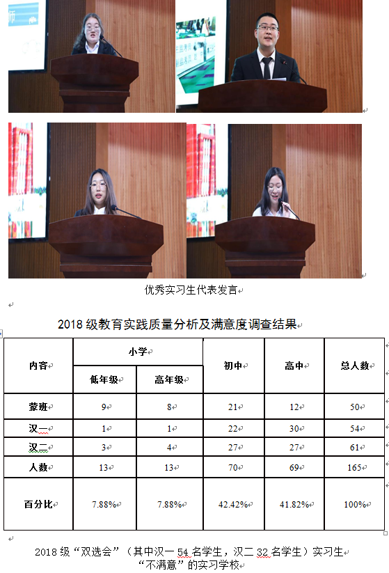 教育实习:2018级师范专业165名同学参加全学期的教育实践,其中双选会135人,分布在57所学校;公费师范生定向实习30人,分布在17所学校。
