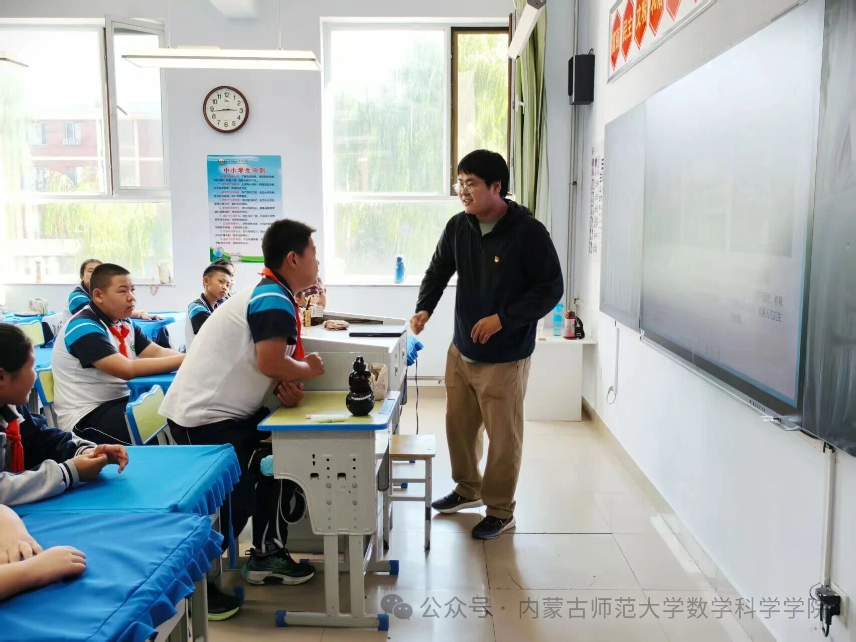 在和林格尔县乳业开发区第一小学,内蒙古科学技术普及学会兼职副秘书长、beat365英国官方网站beat365英国官方网站博士研究生乌日乐等一群研究生科普志愿者,他们用所学的“数据科学与智能信息处理”“基础数学”“应用数学”等学科专业,用通俗易懂的语言,为小学生普及“人工智能是什么”“人工智能会做什么”“机器是怎样看懂图像的”,通过活动让学生积极体验,在活动中感知科技、思考未来、收获新知。