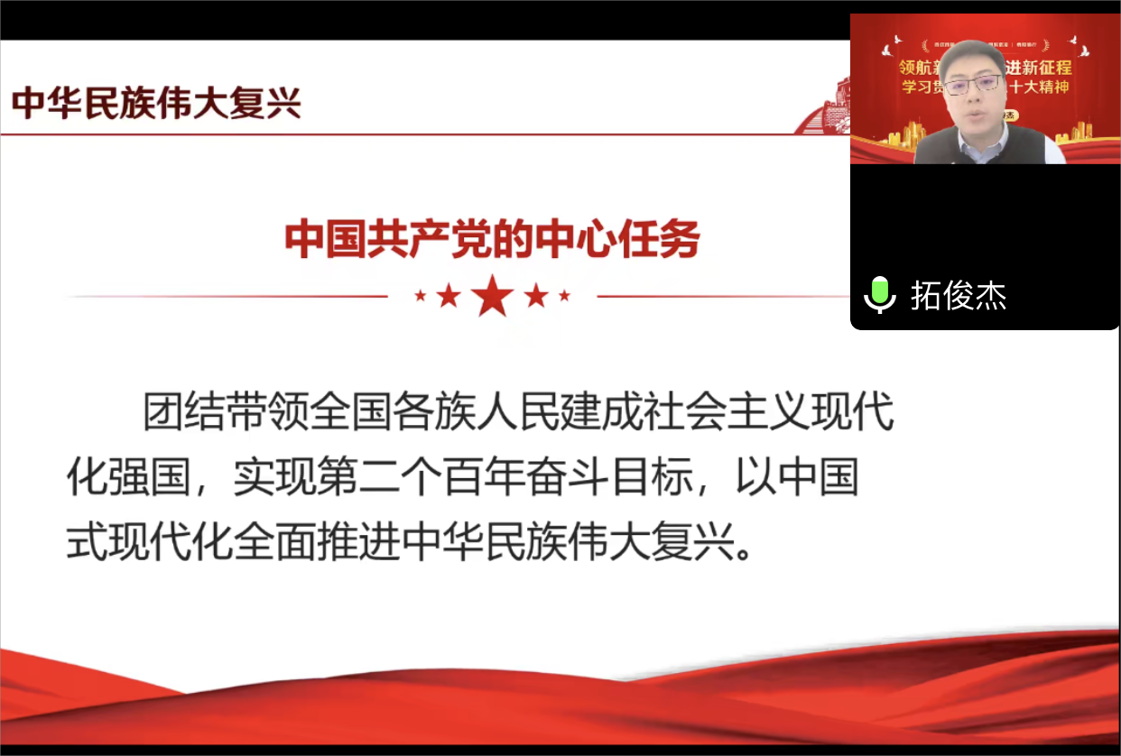 拓俊杰书记围绕深刻把握党的二十大的重要意义、深刻把握过去五年和新时代十年的伟大变革、深刻把握习近平新时代中国特色社会主义思想、深刻把握中国式现代化的中国特色和本质要求、深刻把握全面建设社会主义现代化国家的目标任务以及深刻把握以伟大自我革命引领伟大社会革命的重要要求等方面深入解读了党的二十大精神。拓俊杰书记的宣讲报告内容全面系统、重点突出,引导学员进一步深入领会党的二十大精神实质。beat365英国官方网站教将继续深入学习贯彻党的二十大精神,确保党的二十大精神在学院落地生根,推动学院实际工作。