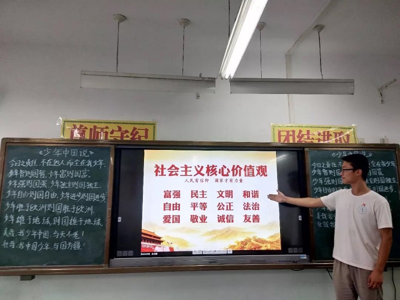 志愿者小老师动情的授课让孩子们理解“诚信”、“敬业”和“爱国”,通过孩子们分享小故事以及生活中简单事例,深入分析,逐渐让孩子们从心里感悟。还通过简单却富有哲理的箴言使小学生内化于心、外化于行。少年强则国强,少年独立则国独立,今天做祖国的好儿童,明天做祖国的建设者,美好的生活属于少年,美丽的中国梦属于少年。