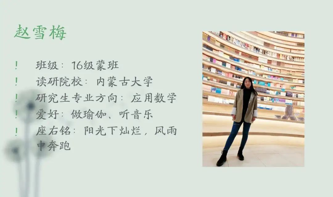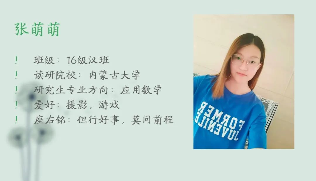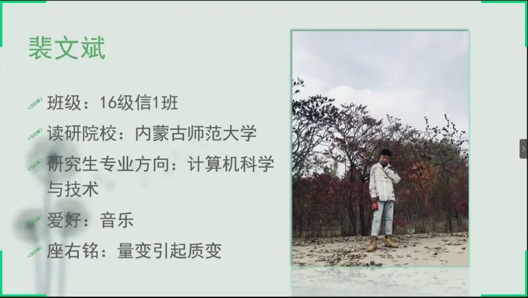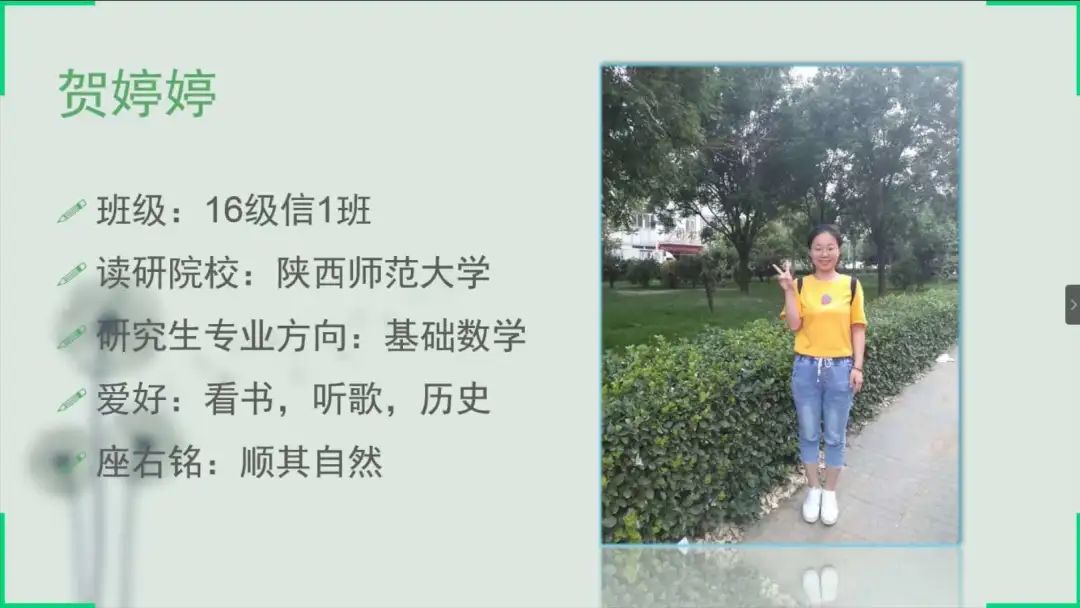 为树立优良学风,同时给有考研意向的同学们提供一个可以获取更多考研信息的机会,2020年7月11日下午,beat365英国官方网站利用腾讯会议平台举办了考研经验交流会,此次交流会邀请到了beat365部分16级考研成功的学子——赵小红、贺婷婷、吉雅、裴文斌、朱慧敏、张萌萌、赵雪梅、尼日嘎拉、韩磊、刘慧、冯晶。本次考研经验交流会由17级信息一班贾宇婧主持,beat365各班同学积极参加了本次交流会。