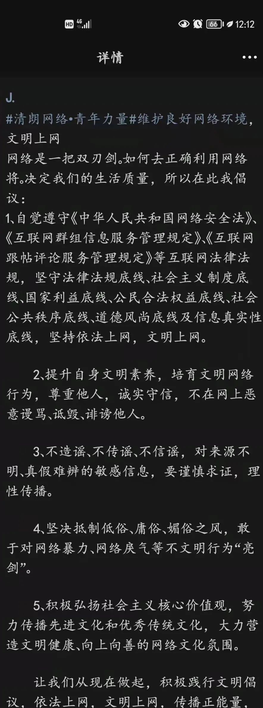 "清朗网络空间的建设,青年不做置身事外的旁观者,而要做勇于担当的生力军。这是因为,时代的进步中,有青年的责任;祖国的梦想中,有青年的梦想。清朗网络空间,看我青年力量!"