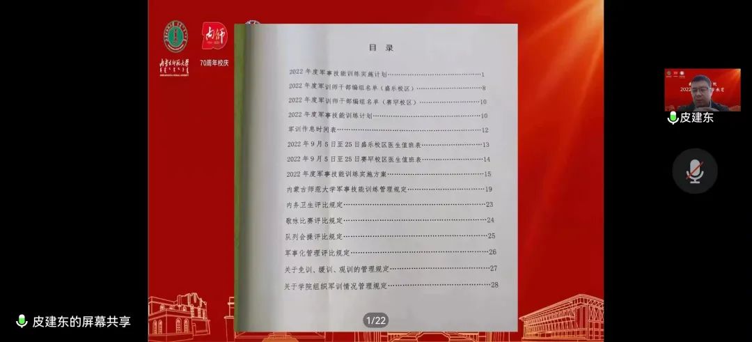 9月6日上午7:30,beat365英国官方网站于线上举办2022年度学生军事技能训练动员大会。学院学生思想政治工作辅导员刘沙沙老师主持此次会议,beat365英国官方网站党委副书记、副院长季建光老师、学院团总支书记皮建东老师参加此次会议。