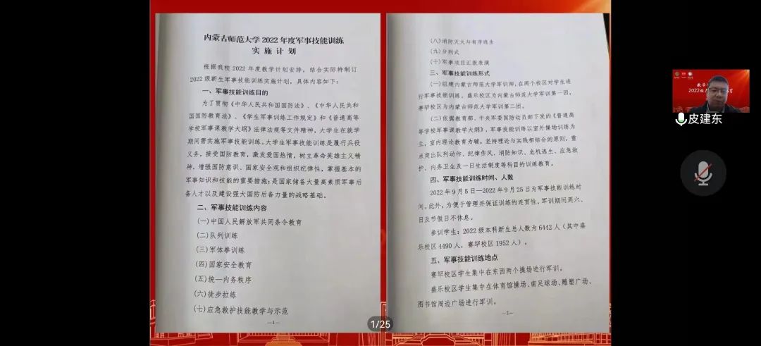 会议第一项,由皮建东老师进行动员讲话,他向同学们详细介绍了2022年度军训技能训练计划、军训管理规定、军训评比内容以及标准、注意事项和规章制度等。并希望同学们通过军训强身健体、淬炼意志,发扬数科学子不怕吃苦、顽强拼搏的精神,服从指挥,努力训练,争取取得优异的军训成绩。
