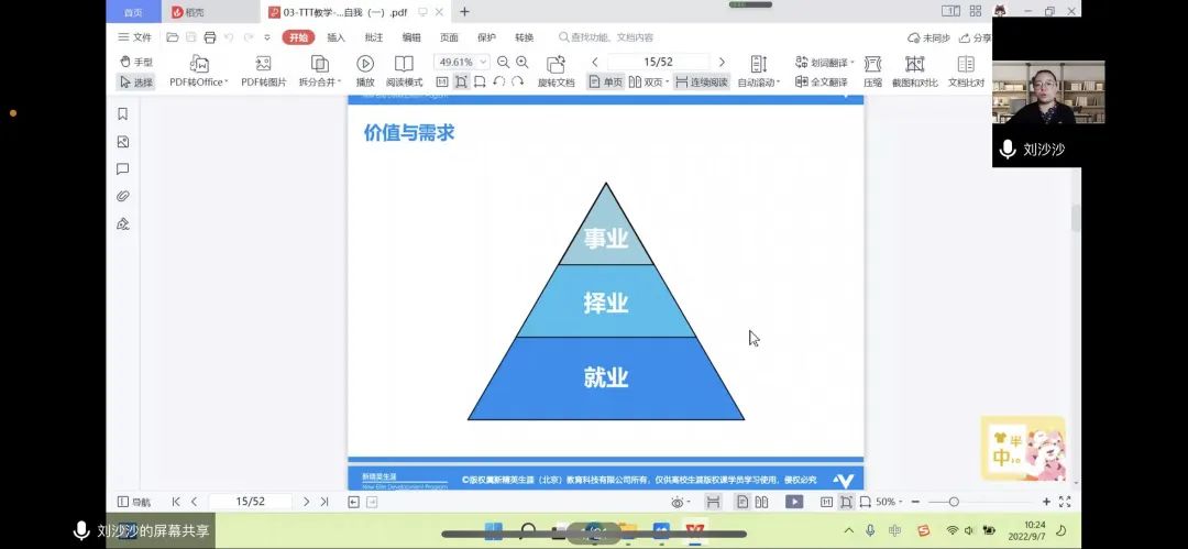 为帮助新生了解专业发展动态、强化专业归属感,树立专业学习信心,培养专业意识和思维能力,激发学习内在动力,9月7日上午10点,beat365英国官方网站学生思想政治辅导员刘沙沙老师于腾讯会议上开展了“2022级新生入学教育——新生学业规划引导教育讲座”。