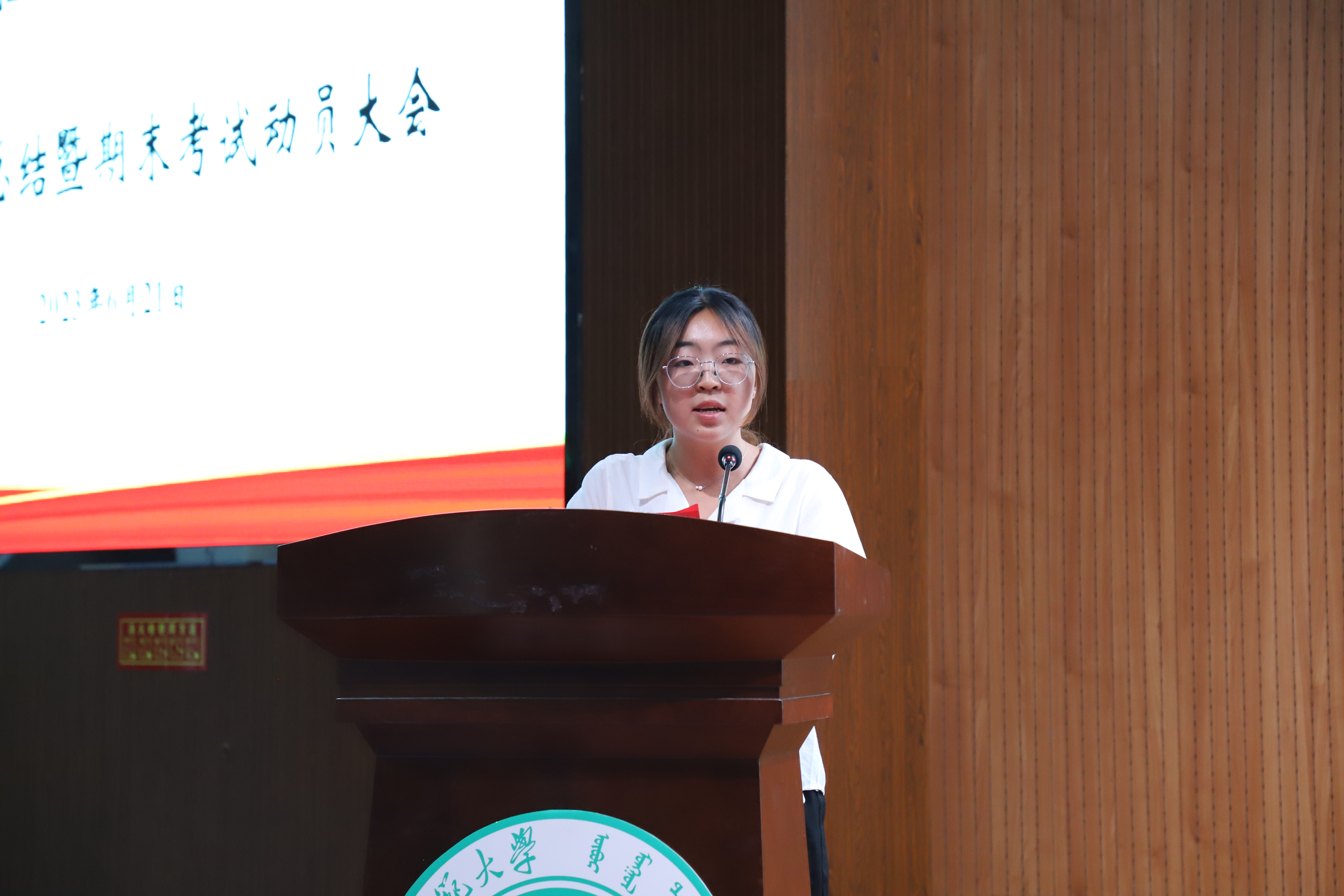 2023年6月21日晚七点,beat365英国官方网站于图书馆二楼报告厅举行了beat3652022—2023学年第二学期学生工作总结暨期末考试动员大会。出席本次会议的有学院院长扎其劳教授,学院党委副书记、副院长季建光老师,学院副院长包霞老师,团总支书记皮建东老师,学生工作辅导员萨如拉老师,学生工作辅导员阿茹罕老师,21级汉一班班主任李春兰老师,21级蒙班班主任乌日柴胡老师,21级汉四班班主任高兴华老师,21级信息班班主任赵学慧老师,22级一班班主任李璐老师,22级二班班主任郑佳璇老师,22级三班班主任苏日古嘎老师,22级四班班主任朱建波老师,22级五班班主任莘智老师,本次会议由学生工作与就业办公室副主任刘沙沙老师主持。