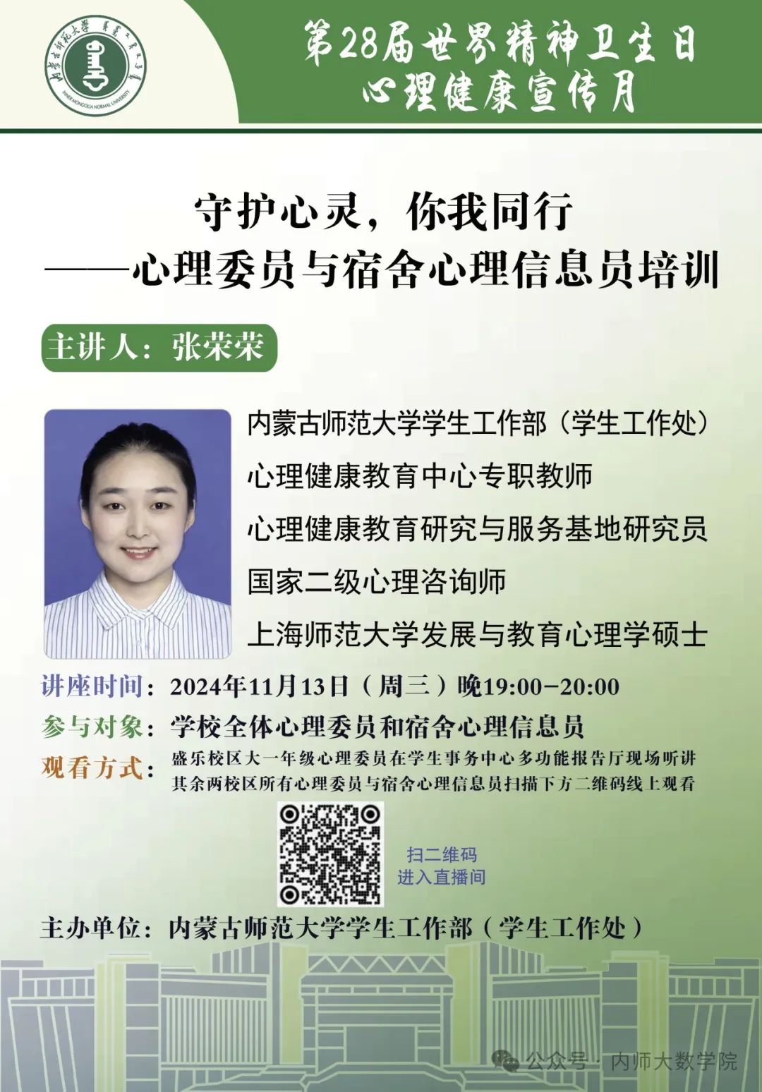 本次培训由心理健康教育中心专职教师、心理健康教育研究与服务基地研究员、国家二级心理咨询师、上海师范大学发展与教育心理学硕士张荣荣老师主讲,为大家带来一场心灵的滋养之旅。