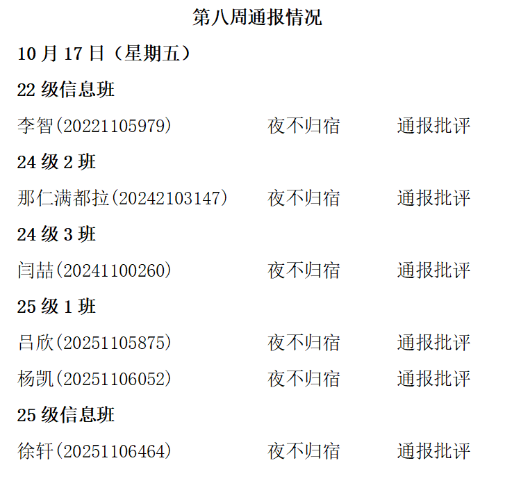 beat365英国官方网站2025——2026年度第一学期第八周通报情况