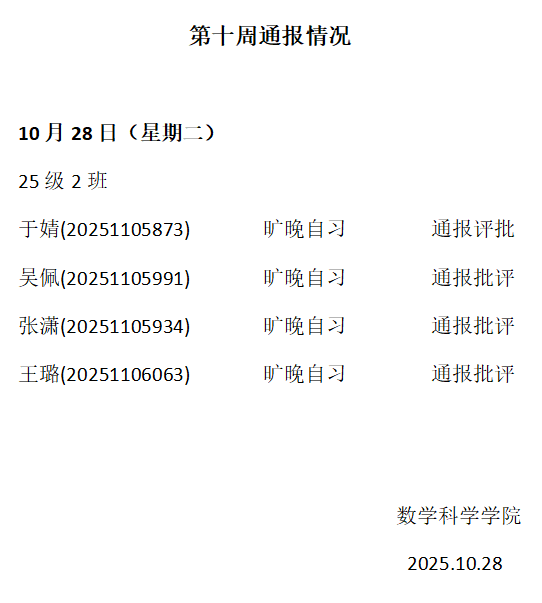 beat365英国官方网站2025——2026年度第一学期第十周通报情况