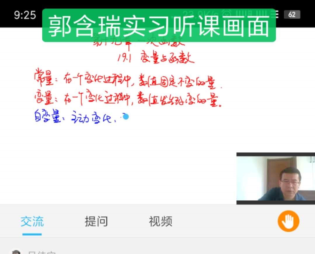 实习场所从学校转移到了家里,不变的是师大二附中老师们在课堂上的谆谆教诲。在初二数学组的苏老师的课堂上,他丰富的专业知识,娴熟的教学技巧,浑然天成的教学风格都让我收获颇丰,启发良多。一边听课一边思考,作为实习生,我认真思考实际的课堂上应该怎样教好学。