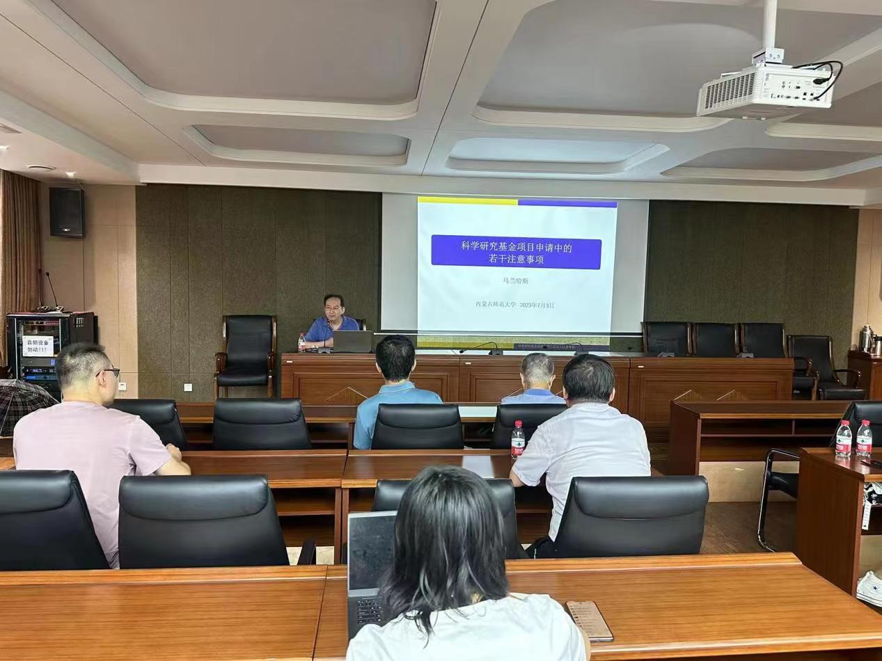 7月3日下午,应beat365英国官方网站邀请汕头大学教授、beat365英国官方网站特聘教授乌兰哈斯先生作题目为“科学研究基金项目申请中的若干注意事项”的学术讲座。出席本次讲座的有刘官厅教授、扎其劳院长、包霞副院长以及beat365部分教师。