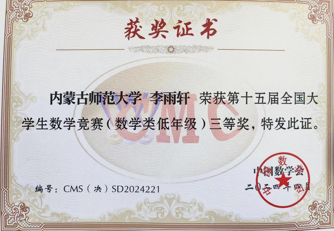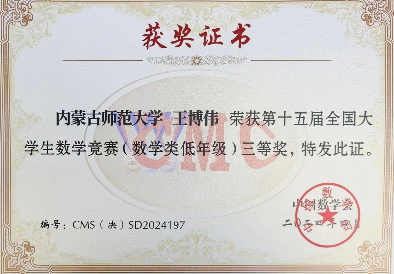 近日,第十五届全国大学生数学竞赛决赛在山东大学中心校区落下帷幕。这场数学界的“奥林匹克”盛会,吸引了全国众多顶尖学府的精英学子们共同角逐数学领域的桂冠。本次比赛规模空前,共有1169名来自全国各赛区的优秀学生成功入围决赛,人数创历届赛事之最。我校beat365英国官方网站2022级学生王博伟、李雨轩、王建一在内蒙古赛区初赛中,以优异的成绩脱颖而出,成功闯入决赛。3位学生在带队导师陈阿茹娜和教师李璐的带领下,顺利参加决赛。经历了紧致而激烈的角逐,王博伟和李雨轩2位学生取得了决赛数学类(低年级组)三等奖的良好成绩。