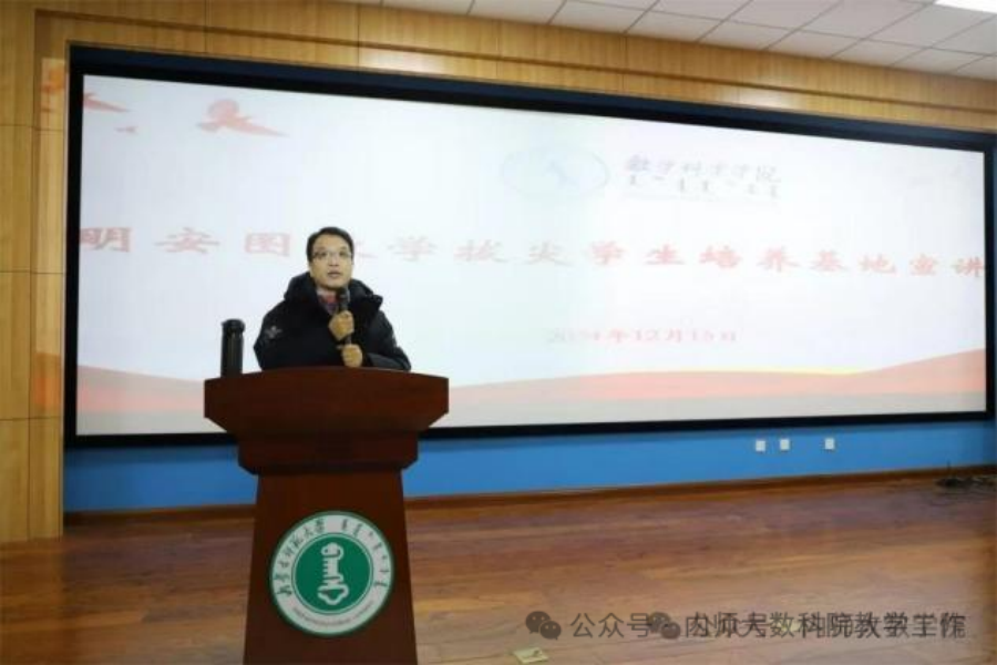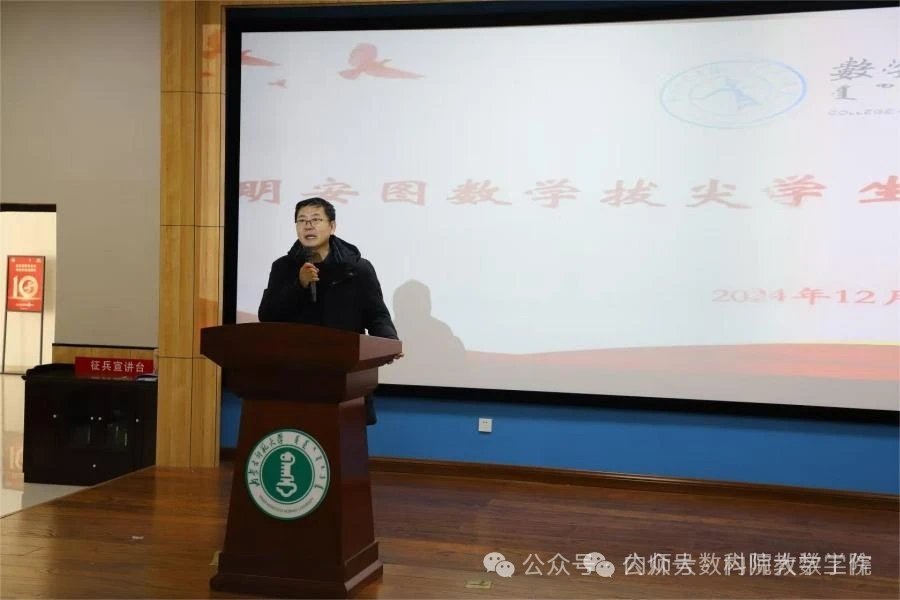 12月15日,beat365英国官方网站在学生事务中心一楼107报告厅开展“明安图数学拔尖学生培养基地”(以下简称明安图数学基地)招生选拔宣讲会。学院党委书记张伟、院长扎其劳出席会议并讲话。2024级数学与应用数学(非定向)、信息与计算科学、统计学三个专业学生与班主任参加会议。会议由学院副院长萨和雅主持。