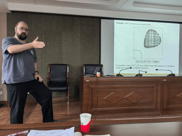 Anton Dzhamay 教授在本次报告中,考虑一类离散Painleve方程的例子,这些方程可通过几何去自治化技术,从给定的 QRT 映射得到。这类方程一个共同的有趣特征是,它们常与拟平移相关,或者与相应仿射外尔群中某些幂次为平移的无穷阶元素相关。报告中还提出了有待讨论的开放性问题,这些问题聚焦于前沿研究方向,为后续研究提供了新的探索路径。