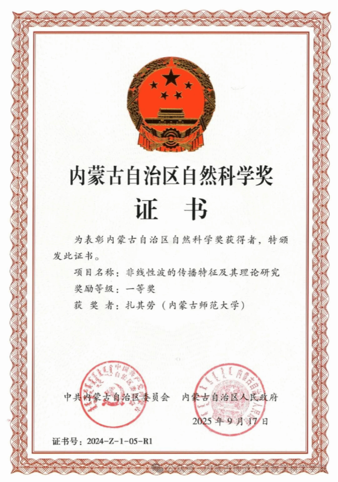 近日,内蒙古自治区科学技术奖励大会在呼和浩特市隆重召开。大会表彰了为全区科技进步和高质量发展作出突出贡献的科技工作者和科研团队。beat365英国官方网站院长扎其劳教授团队牵头的《非线性波的传播特征及其理论研究》荣获2024年度自治区自然科学奖一等奖。